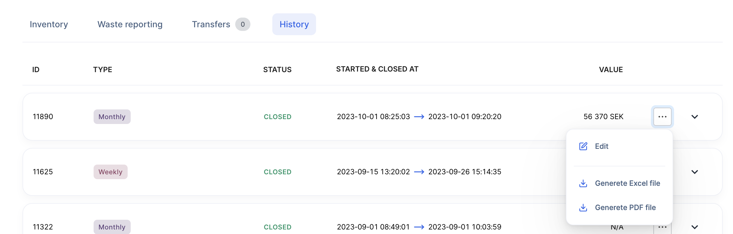 Access the history to review and download your previous inventories. Admin users, such as your regional manager, can also make corrections to previous inventories. Press the three dots to the right of the desired inventory, then edit, to enter the correction mode.