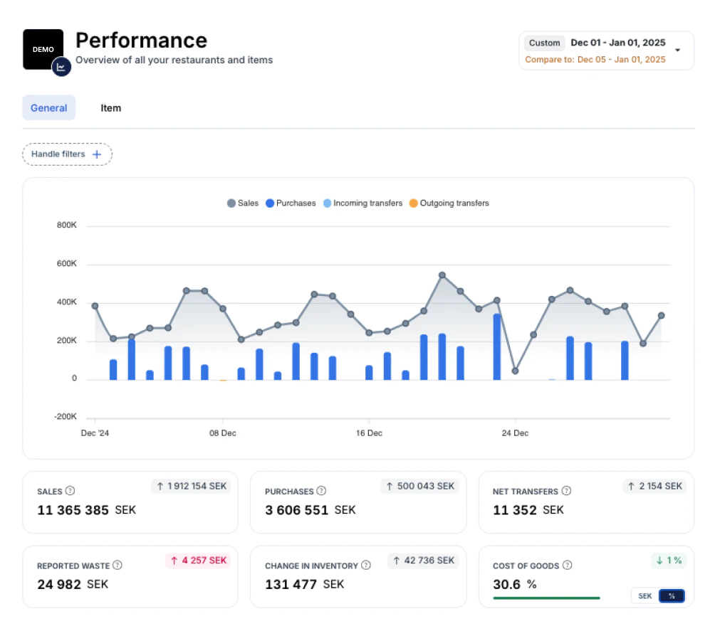 General Performance är en ny dashboardsida som ger en övergripande bild av restaurangens resultat. Här visas bl.a. försäljning, inköp samt den totala råvarukostnaden mellan fullständiga inventeringar. Vi visar även i denna vy Performance Score, en item-performance indikator som kan användas för att hjälpa dig avgöra om råvarukostnaden är korrekt. I denna vy kan du även skapa filtertaggar för att analysera råvarukostnaden för specifika kostnadsgrupper och se hur stor andel av den totala försäljningen som exempelvis alkohol, mat eller förbrukningsartiklar utgör.