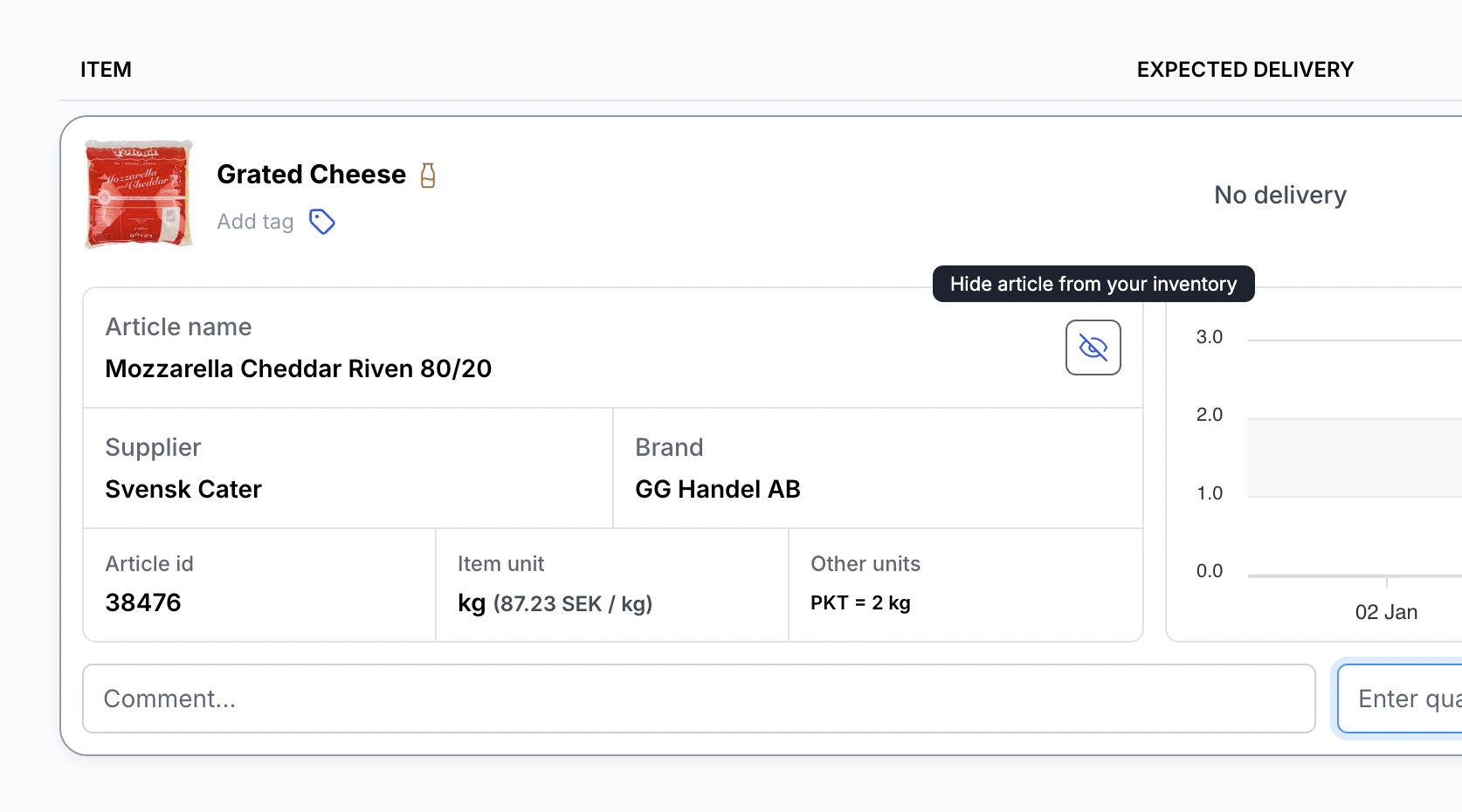 Du kan nu aktivt dölja artiklar i din inventering om de inte längre används i din restaurang. Gå till artikelns informationssektion och klicka på ögonikonen för att ta bort artikeln från visningen. Om du köper artikeln igen i framtiden kommer den automatiskt att visas i inventeringen igen.