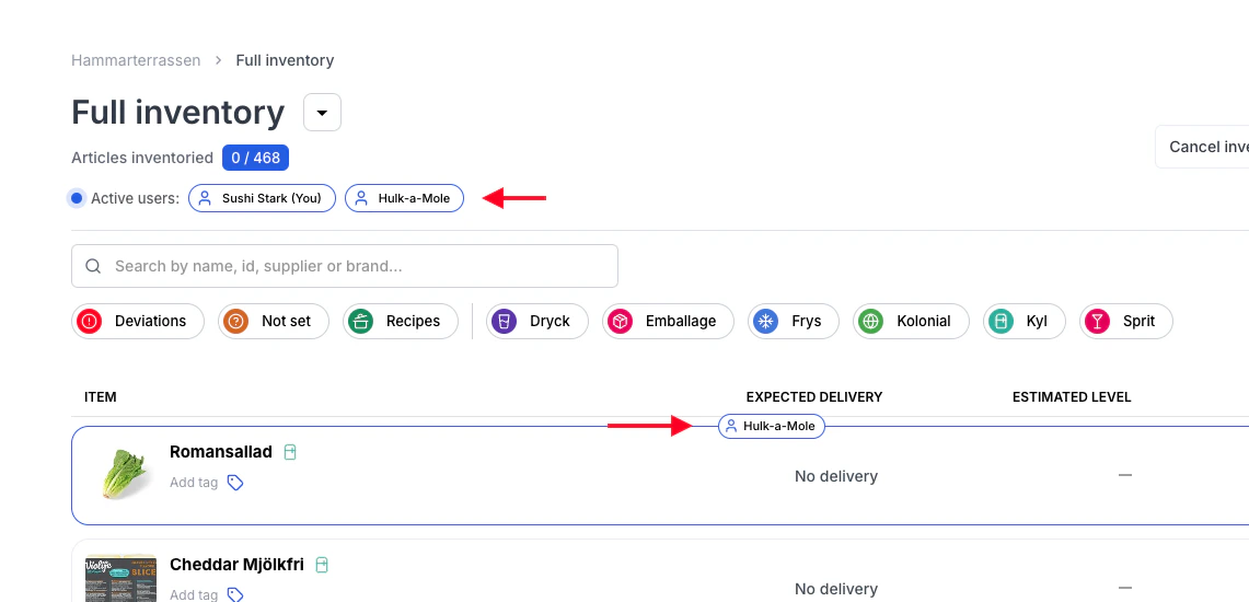 Vi har gjort det ännu enklare att samarbeta i en inventering. När flera användare är inloggade samtidigt kan ni nu se vilket item som respektive person för tillfället arbetar med.