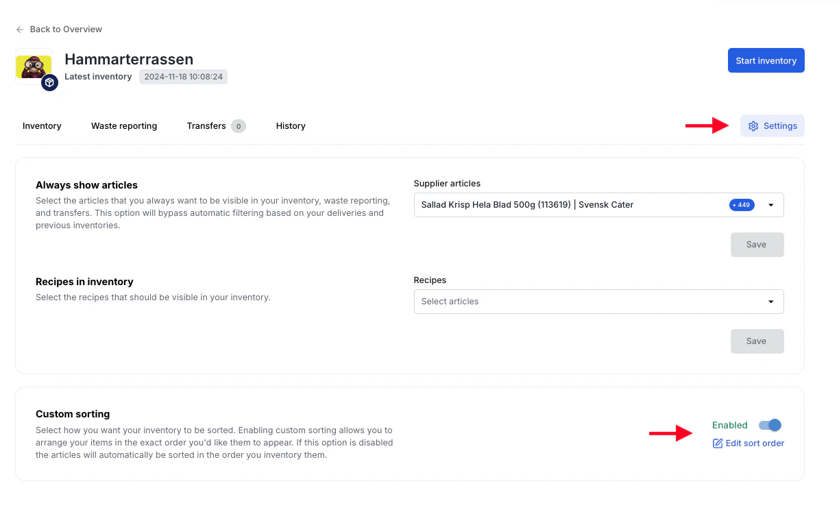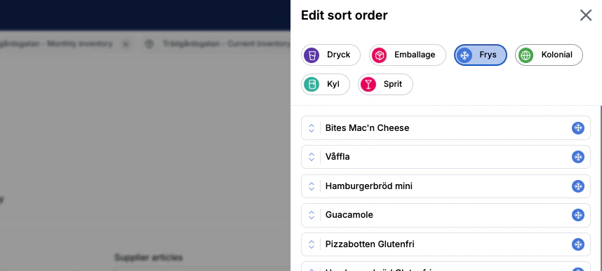 Du kan nu använda egen sortering av artiklar i inventeringen. För att aktivera denna funktion, gå till Inventory > Settings och välj ‘Activate custom sortering.’ För att redigera ordningen, klicka på ‘edit sorting och dra och släpp artiklar i den ordning du föredrar.
