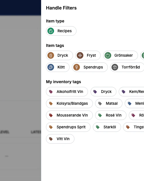 Filter är nu grupperade i ett en ny filterpanel, tillgänglig i Inventory, Purchasing, Recipes och Items. Fler filteralternativ har också lagts till. Till exempel kan inköpslistor nu användas som filter i Butik. Superadmins kan hantera denna behörighet under Recipes & Items > Purchase lists.