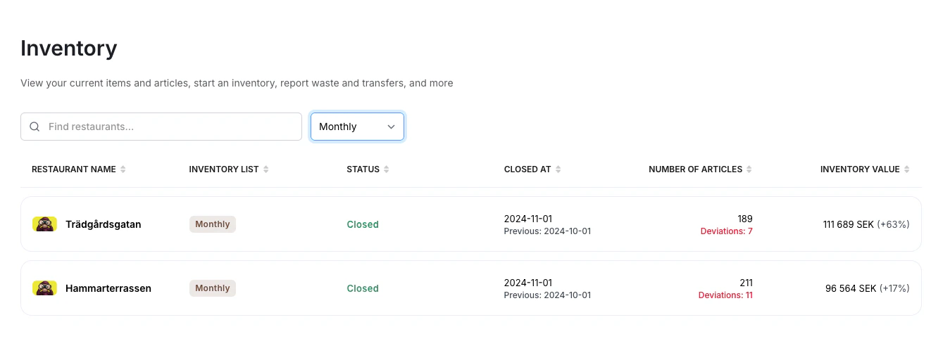 Recept kan nu inventeras. Gå till receptvyn för att ange om ett recept ska vara inventerbart samt vilken kostnadsgrupp det ska bokföras under i inventeringsrapporten. För att ett recept ska vara synligt i en restaurangs inventeringen behöver du gå till Inventory > Settings och markera vilka recept som respektive restaurang ska kunna inventera.Smidigare samarbete vid inventering