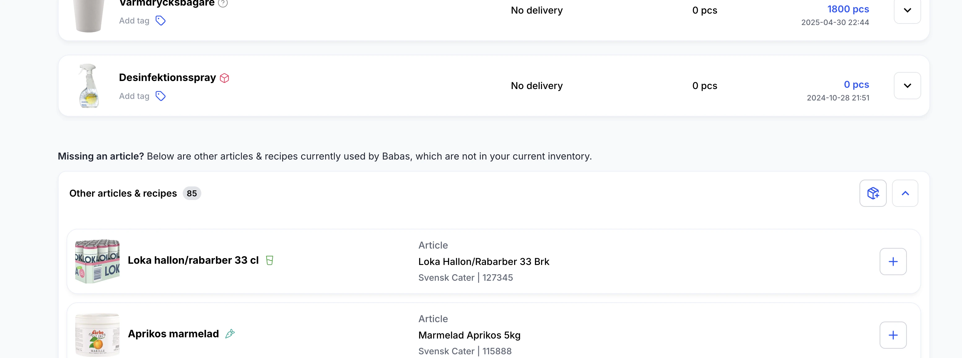 Det är nu enklare att hitta artiklar som finns i ditt projekt men som inte visas i din inventering. Längst ner på inventeringssidan hittar du avsnittet “Övriga artiklar och recept.” Från denna lista kan du enkelt lägga till artiklar i din inventering. Om du du inte hittar artikeln där kan du fortfarande använda alternativet “Lägg till saknad artikel” när du söker.