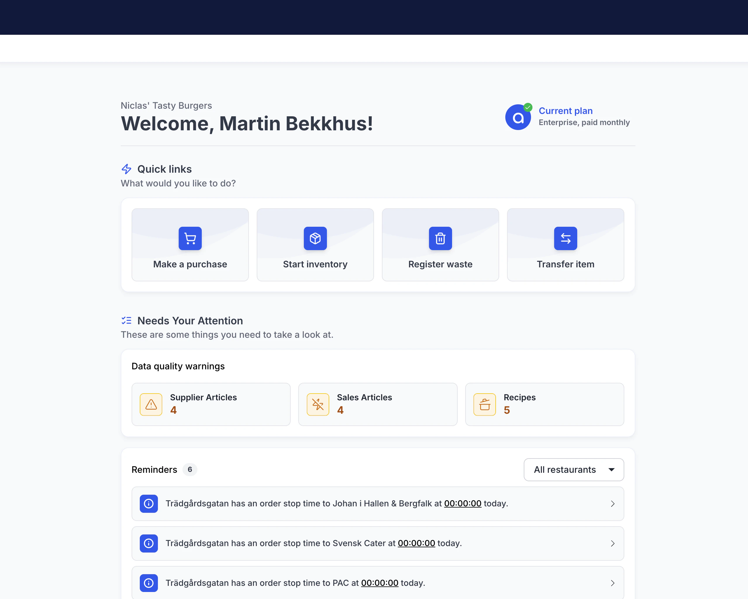 Vi är glada att presentera den första versionen av den nya startsidan! Här hittar du snabbgenvägar till de funktioner du använder mest, påminnelser för restauranger, varningar om datakvalitet (för superadmins) samt ett aktivitetsflöde som visar alla åtgärder som har gjorts i appen av de restauranger du har tillgång till.