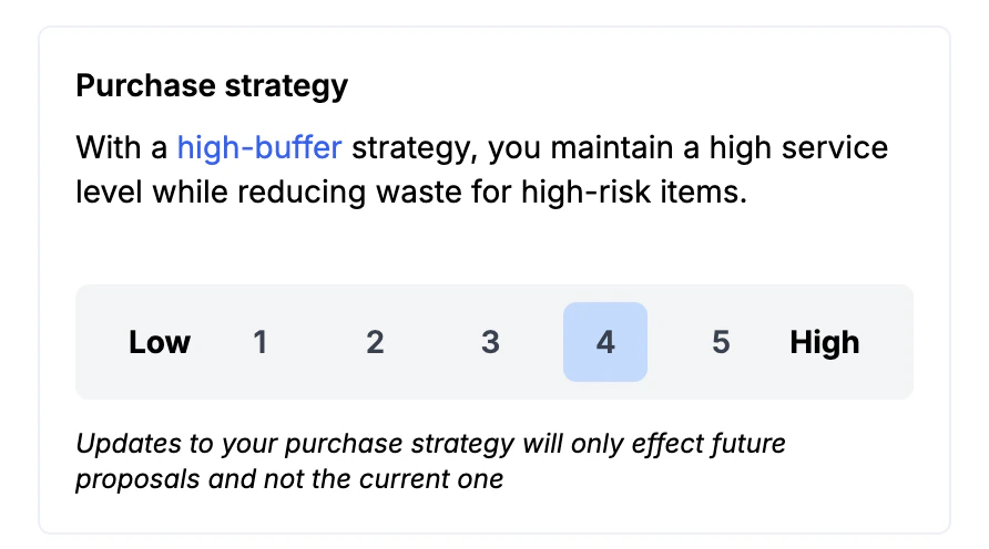 Du kan nu enkelt ändra inköpsstrategin för AI-order rekommendationerna, för att bättre passa dina behov. Denna inställning avgör hur AI balanserar risken för svinn mot att bibehålla lagernivåer. Välj enkelt en nivå mellan 1 och 5: Gå in på ett förslag och klicka på informationssymbolen till höger om en artikel för att uppdatera inköpsstrategin.