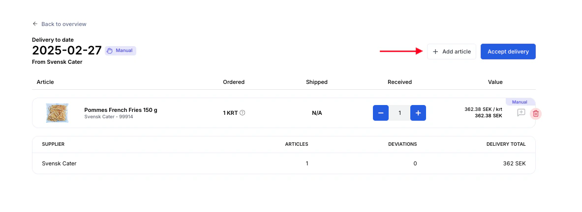 - Börja lägga till artiklar i ordern genom att söka efter dem eller skriva in informationen manuellt.