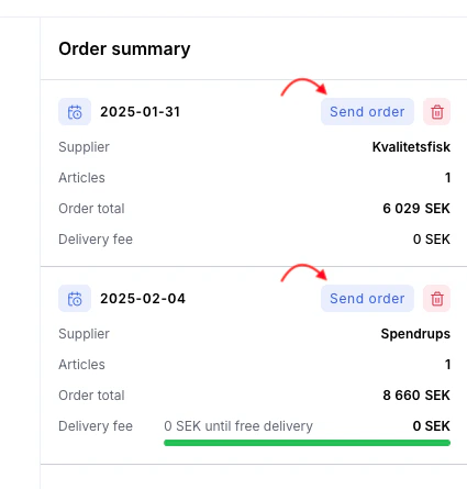 Du kan nu välja att skicka beställningar till en leverantör i taget när du har artiklar från flera leverantörer i samma varukorg. Använd sidomenyn för att skicka ordrar till en leverantör i taget.