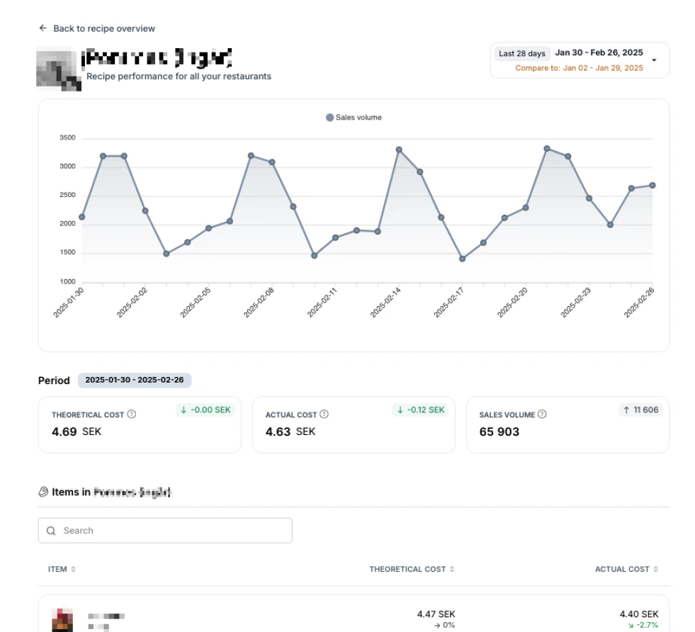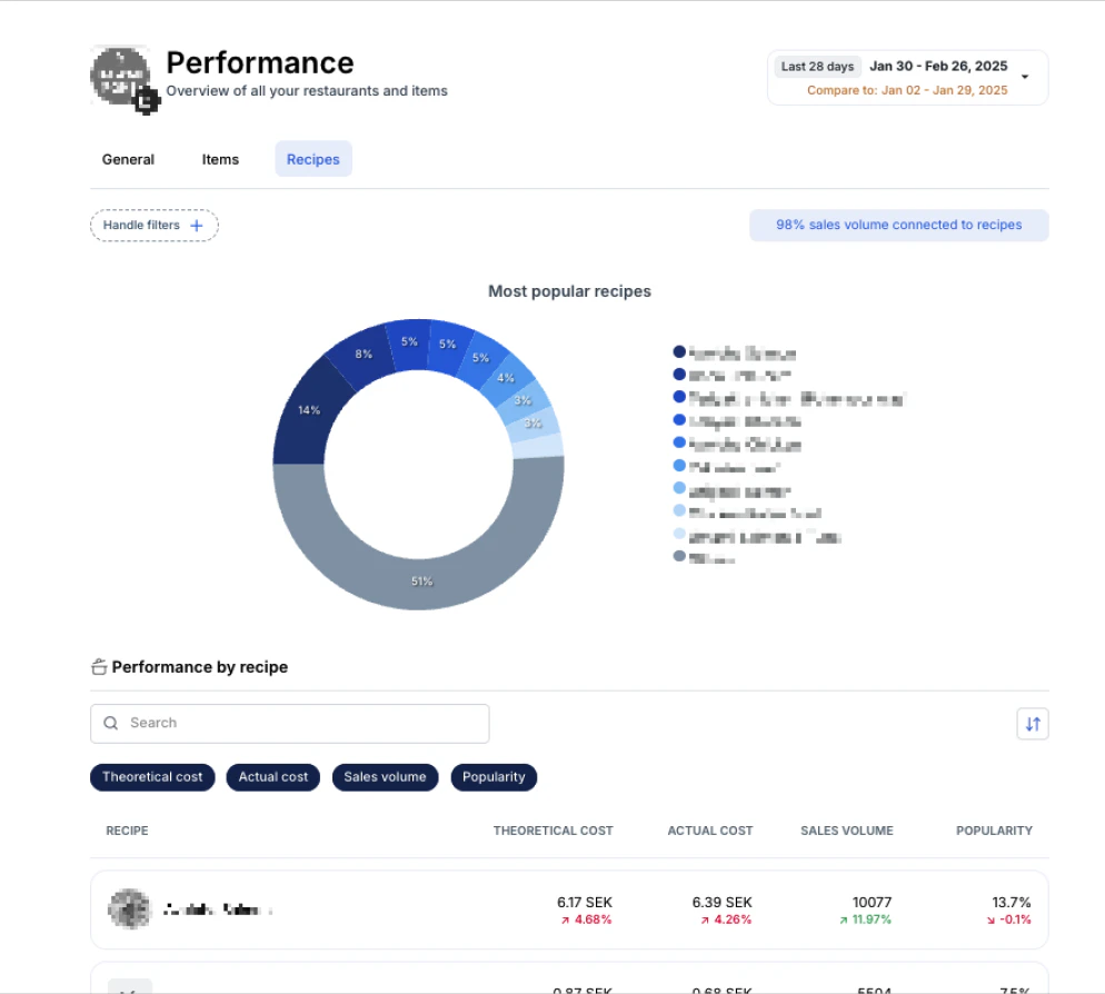 Vi är glada att introducera den första versionen av Recipe Performance! Du hittar Recipes Performance genom att navigera till Performance och sedan välja Recipes. Med Recipe Performance kan du:- Spåra receptkostnader, försäljningsvolym och popularitet